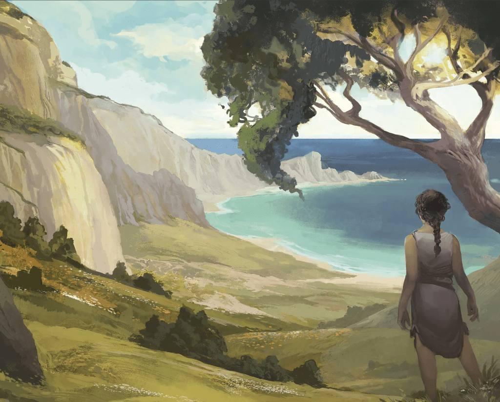 Dillon’s artwork here is Romantically stylized and consistent with her Achilles illustrations. Her depictions of Circe, her island, and the various mythical figures she encounters are both faithful to Miller’s descriptions and imbued with a cinematic sense of drama. The color palette is rich with glowing hues that evoke the magic and mystery of Circe’s world.