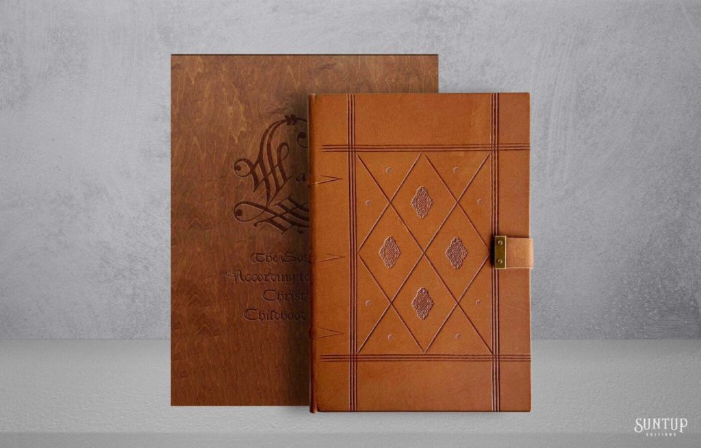 The Lettered Edition is limited to only 26 copies. Hand-bound in calfskin, it features a central clasp and blind tooling that incorporates a triple-line roll and medieval decorative motifs. The binding style pays homage to the way sacred texts were preserved and revered in the Middle Ages. The edition is housed in a custom wooden enclosure featuring butt-joint construction, a hinged lid, and a rich stain that complements the earthy tones of the leather binding.